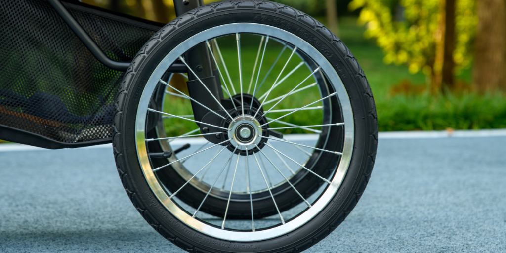 The 3-wheel version with rubber tires handles grass and park paths well, while the 4-wheel version with EVA wheels is smoother on city pavements.