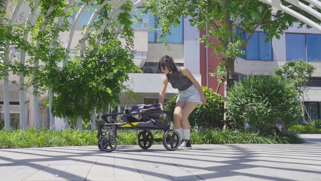 The 3-wheel version with rubber tires handles grass and park paths well, while the 4-wheel version with EVA wheels is smoother on city pavements.