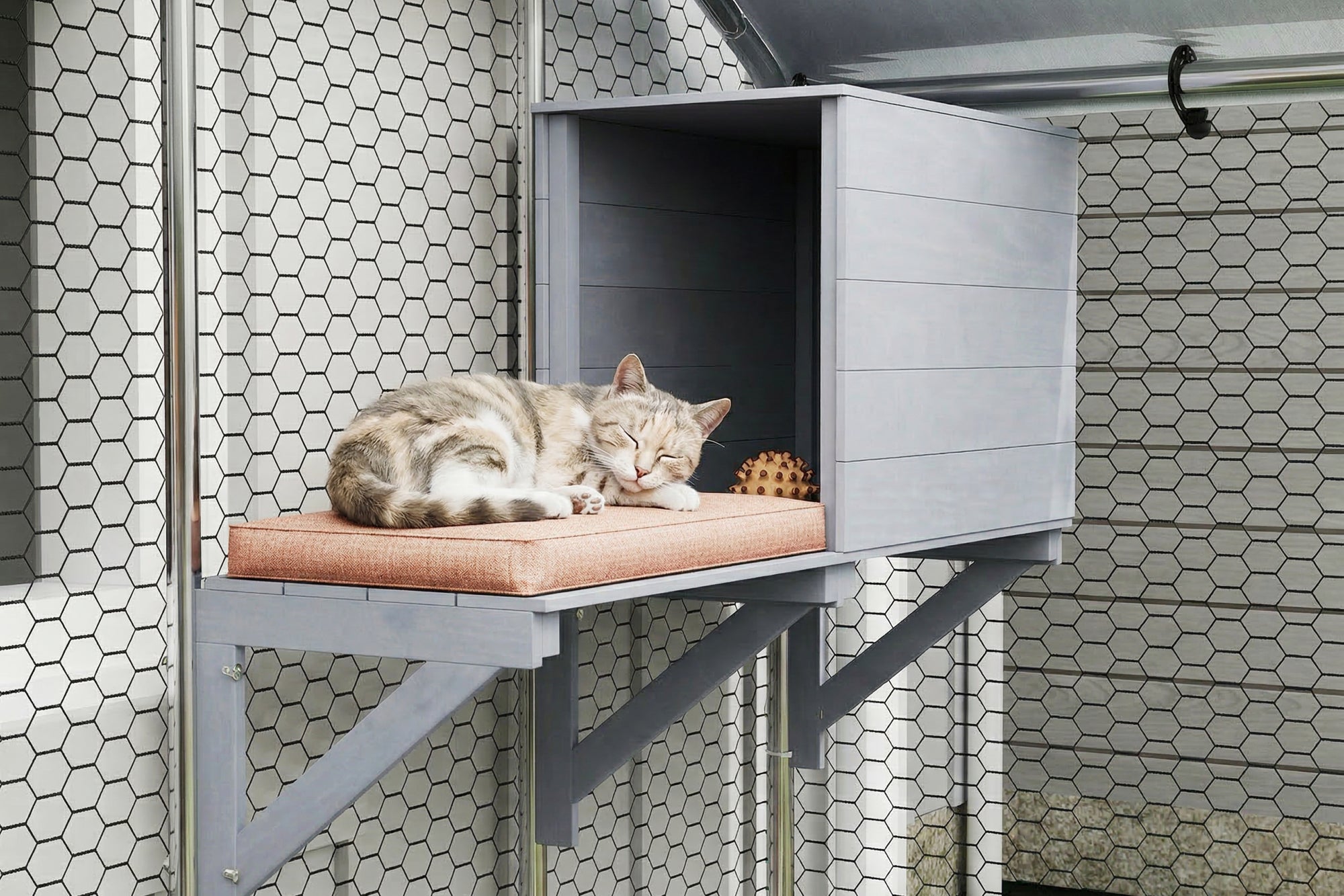 From jumping and exploring to curling up for a nap, this catio supports a full day of natural behaviour.