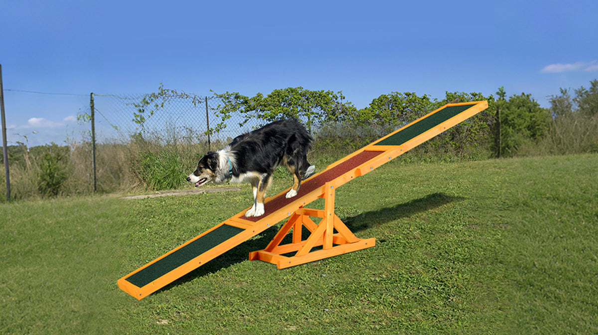 Place a plank or board on a soft object (like a folded towel) to create a low, slightly wobbly platform. Gently encourage your dog to step on it with treats and praise. If they show curiosity or adapt quickly, they’re likely to respond well to our seesaw too..